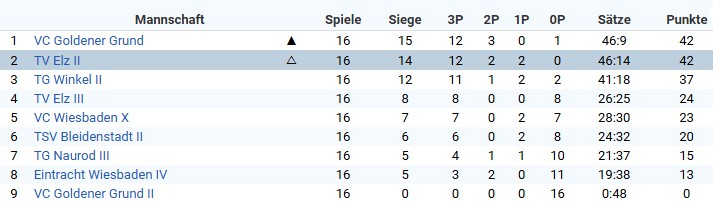 Somit konnte bei nur einer Niederlage in der gesamten Saison am letzten Spieltag die Tabellenspitze punktgleich mit TV Elz 2 erklommen werden. Da Elz eine Niederlage mehr zu verzeichnen hatte, war die Meisterschaft und der damit verbundene Aufstieg perfekt.